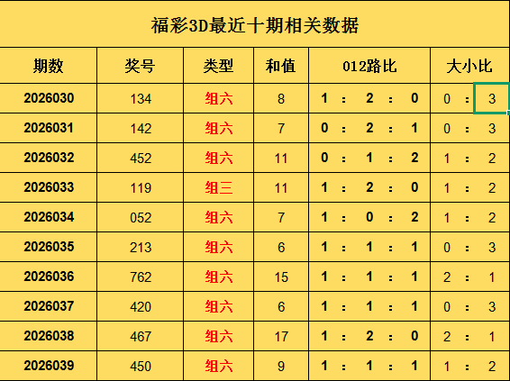 开奖记忆:福彩3D上期奖号为450,其中奖号012路比为1 : 1 : 1,大小比为1 : 2,和值为9。
