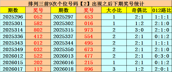 个位号码:上期奖号为小 号、偶数、2路号码:2,历史上个位号码2共开出742期,前一次出当今第2026017期,上期遗漏21期再出。