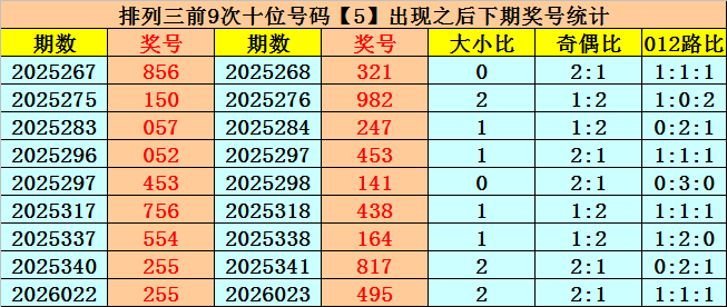 在十位前9次出现号码5后,其下期奖号差别开出:2-8-4-5-4-3-6-1-9,其中奖号个数奇偶比是4:5,大小比是4:5,012路比是3:3:3。