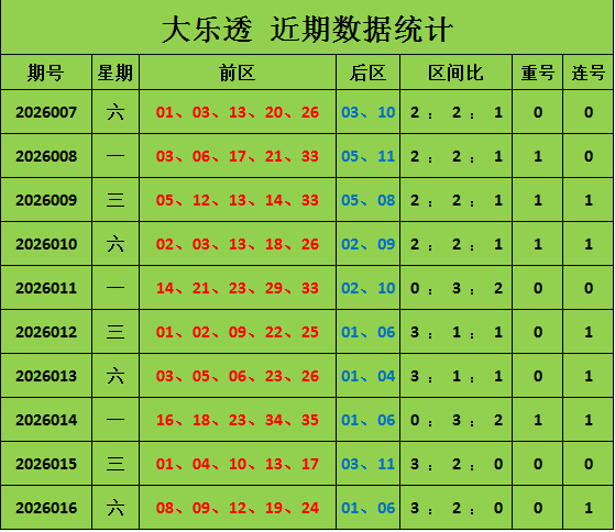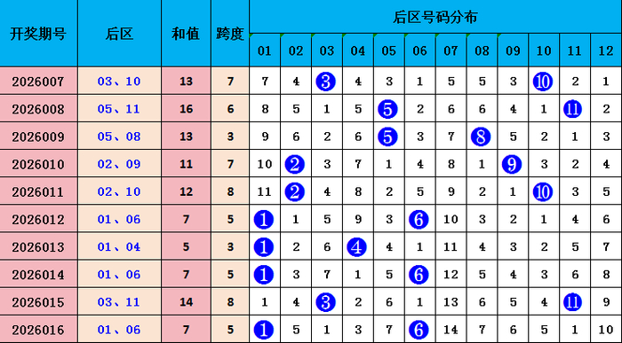上期后区开出号码01 06,和值7,近十期和值13 16 13 11 12 7 5 7 14 7,和值波动规模较大,本期预测和值会高潮,要点心理号码:06 09,和值15。