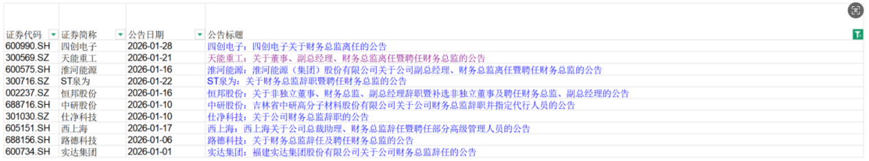 根据同花顺数据,有10个公告涉及财务总监离职,涉及企业包括四创电子、天能重工、淮河能源、ST泉为(维权)、恒邦股份、中研股份、仕净科技、西上海、路德科技、实达集团。