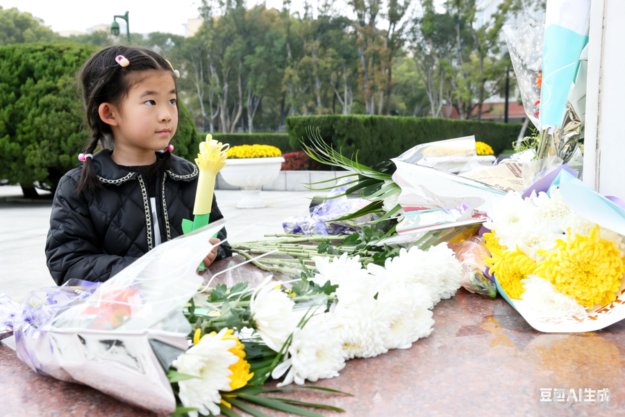 在家东谈主的伴随,孩子瞩目地将花束献给义士。