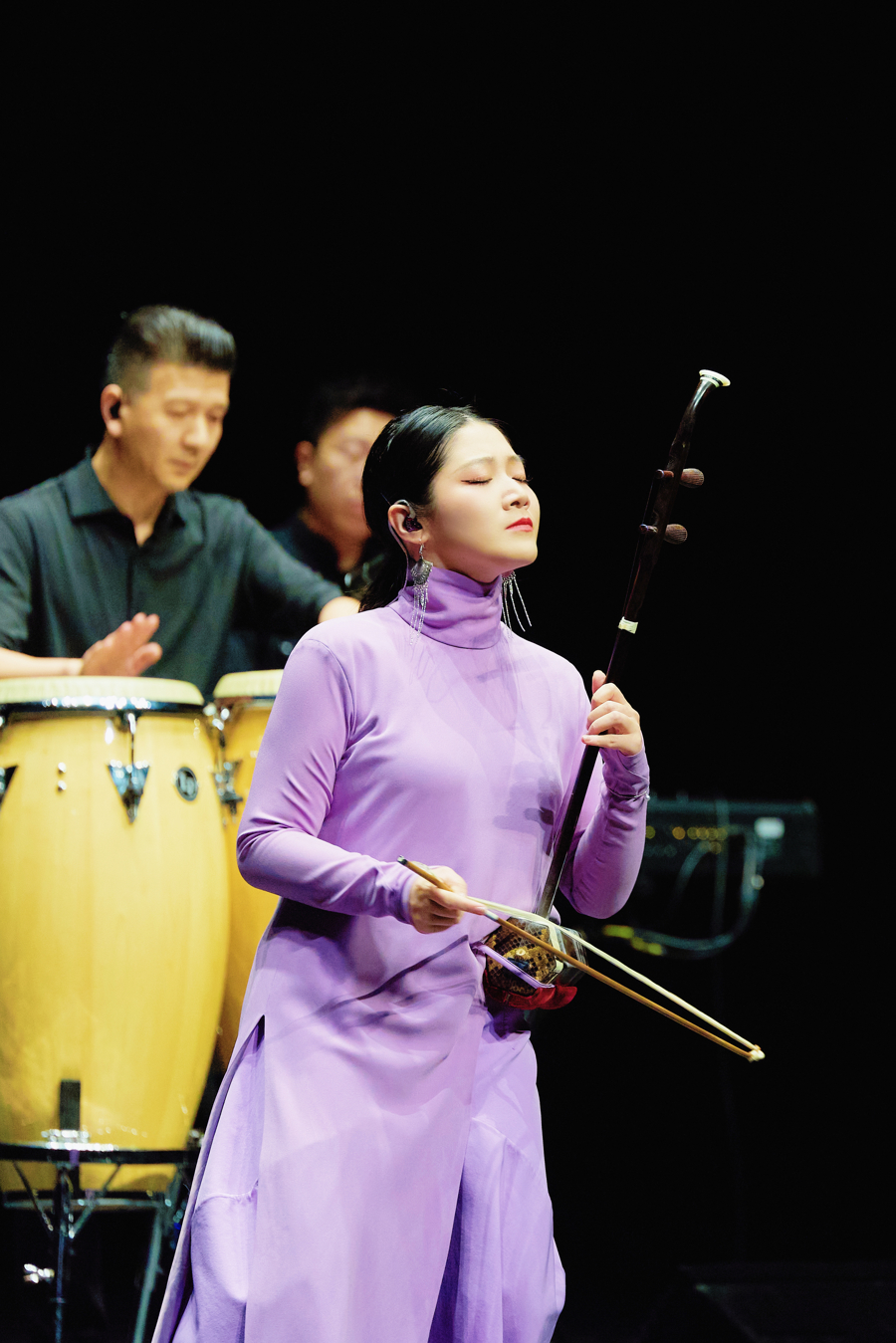 音中有诗,诗中有色,多样民族乐器成为描绘中国色的“声音画笔”:二胡在《轻紫》中与爵士编曲碰撞,勾勒朦胧而优雅的遐想;琵琶声声如珠玉落盘,山水画境的深远在《揉蓝》中深情演绎;中国鼓阵以磅礴之势擂响《玄天》,彰显天地交融的浩然气概;高亢激昂间,唢呐在《茶色》中诠释历久弥新的深厚魅力。终曲《色雅》,和而不同的多彩旋律,汇就美美与共的动人乐章。