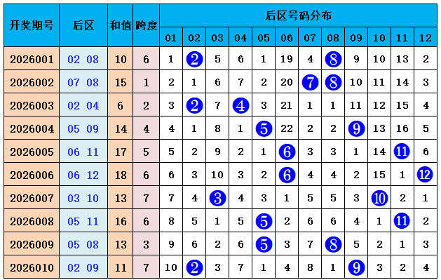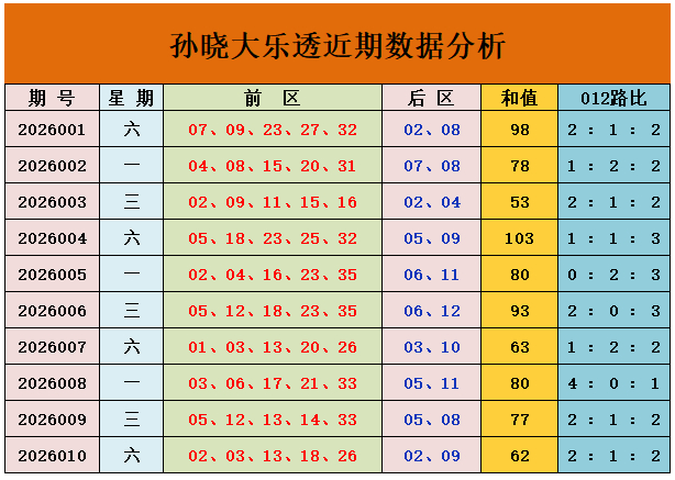 上期回顾:大乐透第2026010期奖号:前区02、03、13、18、26,后区02、09,前区奖号和值为62,012路比为2:1:2,后区开出小大组合02、09