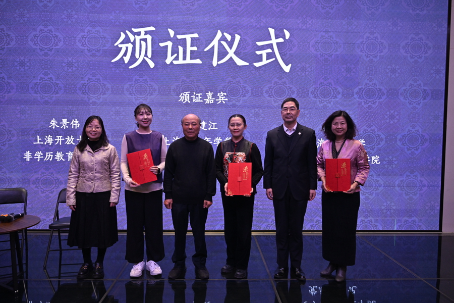 上海市老年学学会会长朱建江与上海开放大学东谈主文与群众处理学院党总支通告林晓英、非学历援助部部长朱景伟一齐为三位主讲嘉宾颁发荣誉文凭。