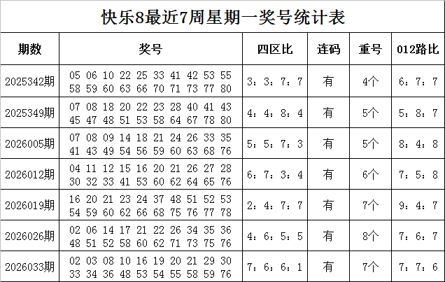 福彩自负8第2026033期(上周一)奖号回来:02 03 08 10 16 19 20 21 29 30 33 34 36 48 53 54 55 58 59 76,其中奖号四区比为7:6:6:1,012路比为7:7:6,包含7个重号02、21、34、36、48、58、76,包含连码02 03、19 20 21、29 30、33 34、53 54 55、58 59。